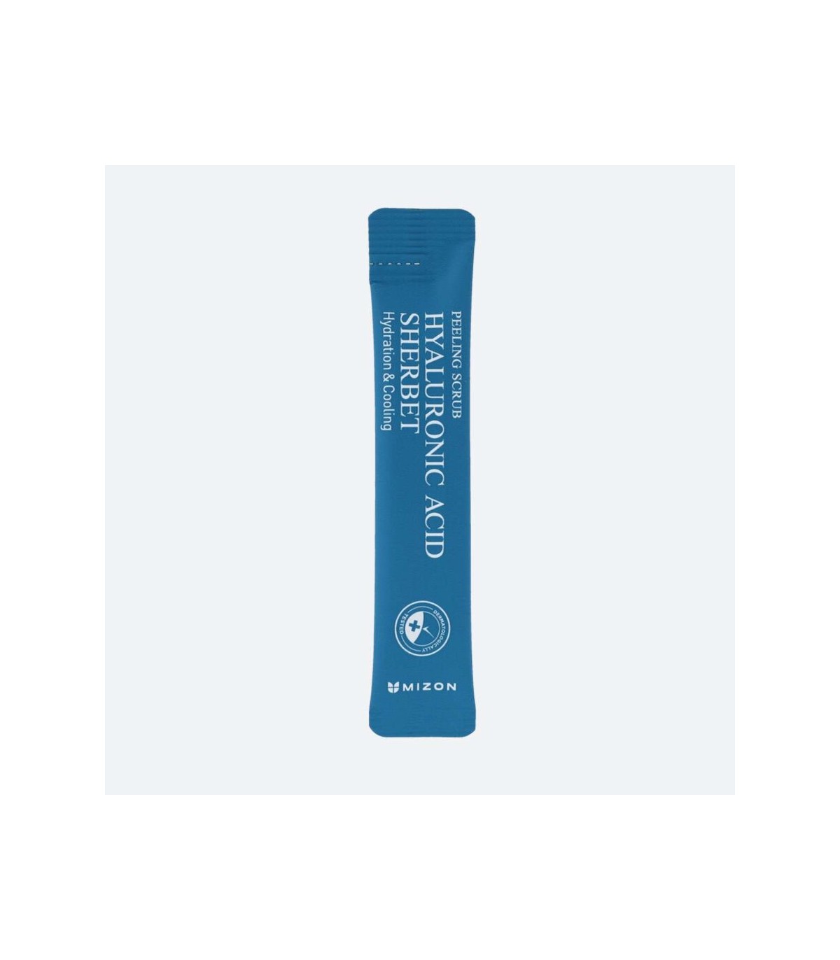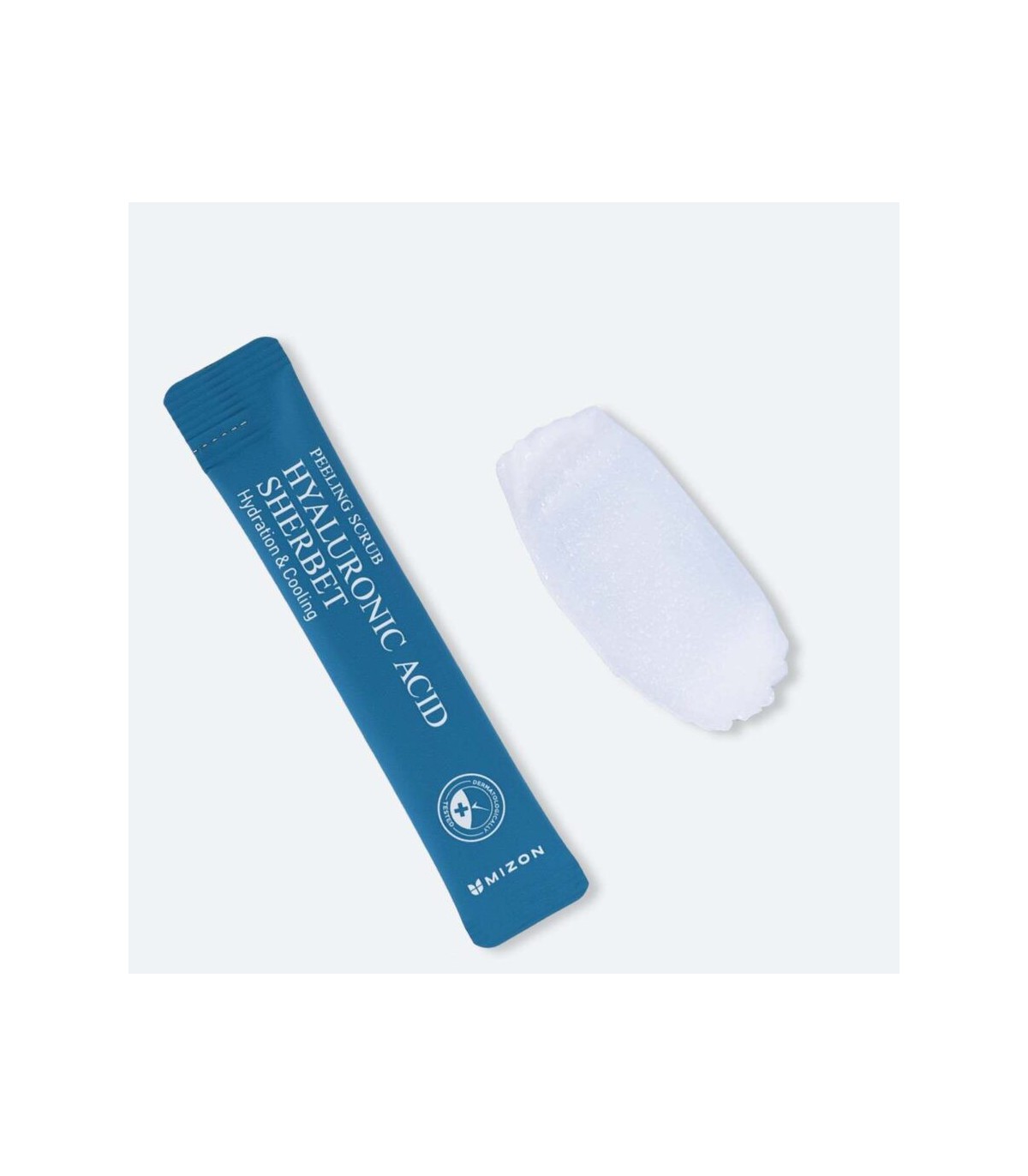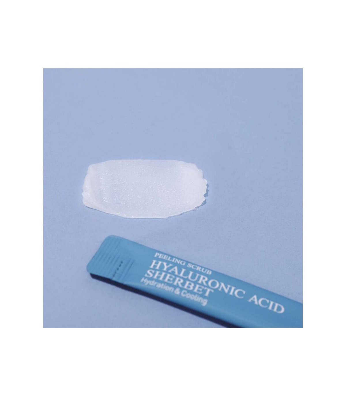 Hyaluronic Acid Sherbet Peeling Scrub , exfoliante hipoalergénico, con una doble acción de exfoliante e hidratante de la piel, gracias al ácido hialurónico, micropartículas de levadura química y proteínas de leche.