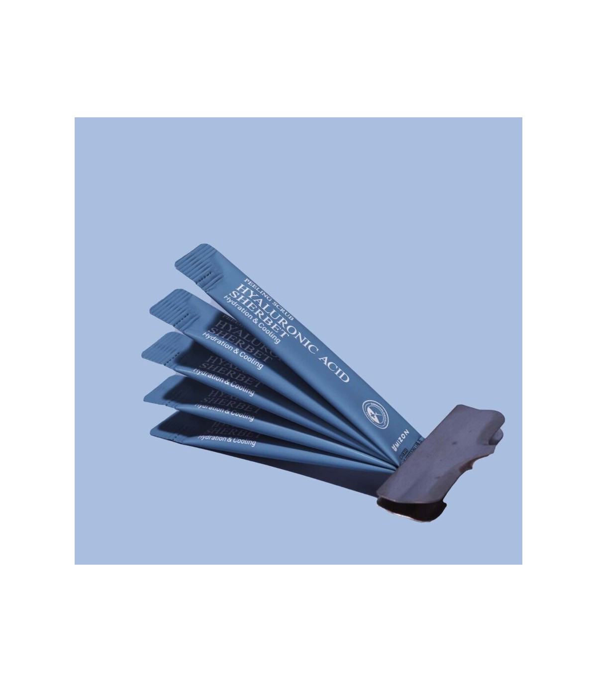 Exfoliante de sorbete de ácido hialurónico formulado con partículas finas de bicarbonato de sodio con tres tipos diferentes de ácido hialurónico humectante para proporcionar una hidratación y nutrición.