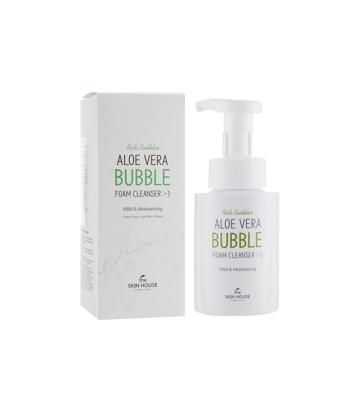 The Skin House Aloe Vera Bubble Foam Cleanser mima tu piel con burbujas suaves y limpiadoras. El aloe contenido en el producto alivia e hidrata la piel áspera, pero la espuma suave y rica lo limpia eficazmente de la suciedad. Apto para todo tipo de pieles, especialmente para pieles sensibles. Ingredientes principales: extracto de aloe.
