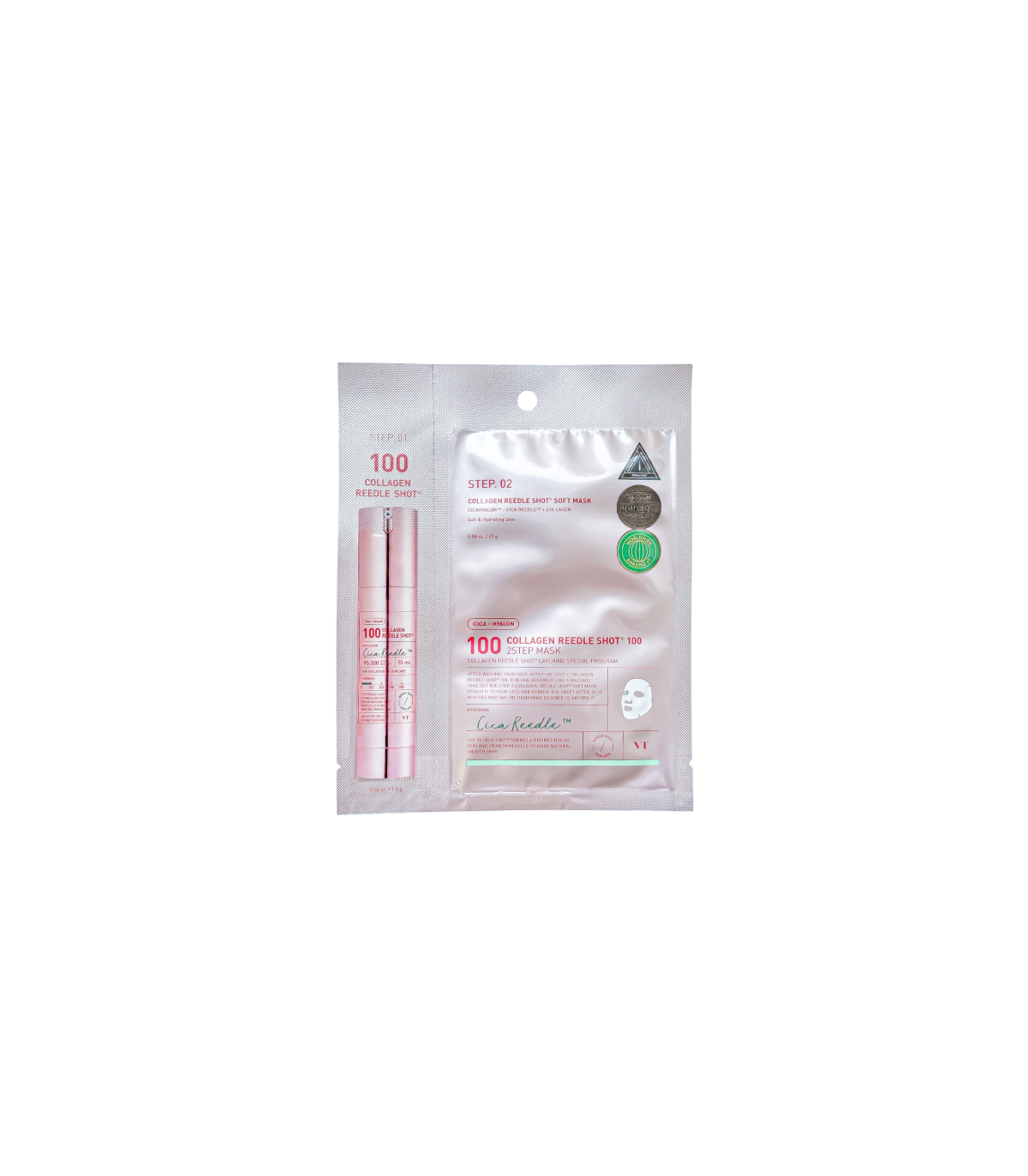 Potencia tu piel con hidratación, firmeza y un efecto lifting visible con VT Cosmetics Collagen Reedle Shot 100 2 Step Mask, el tratamiento intensivo de doble paso para una piel revitalizada, más suave, elástica y luminosa.