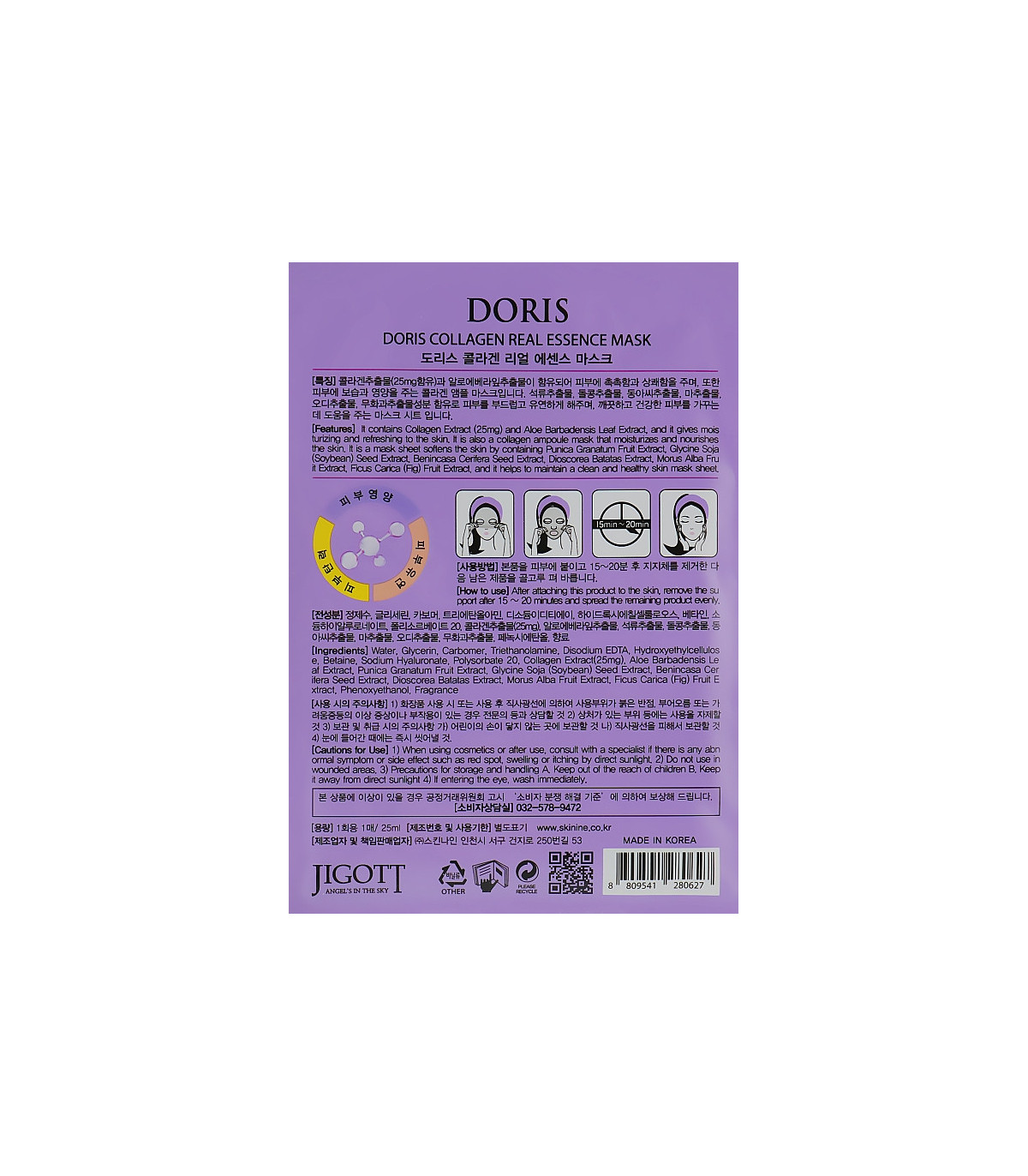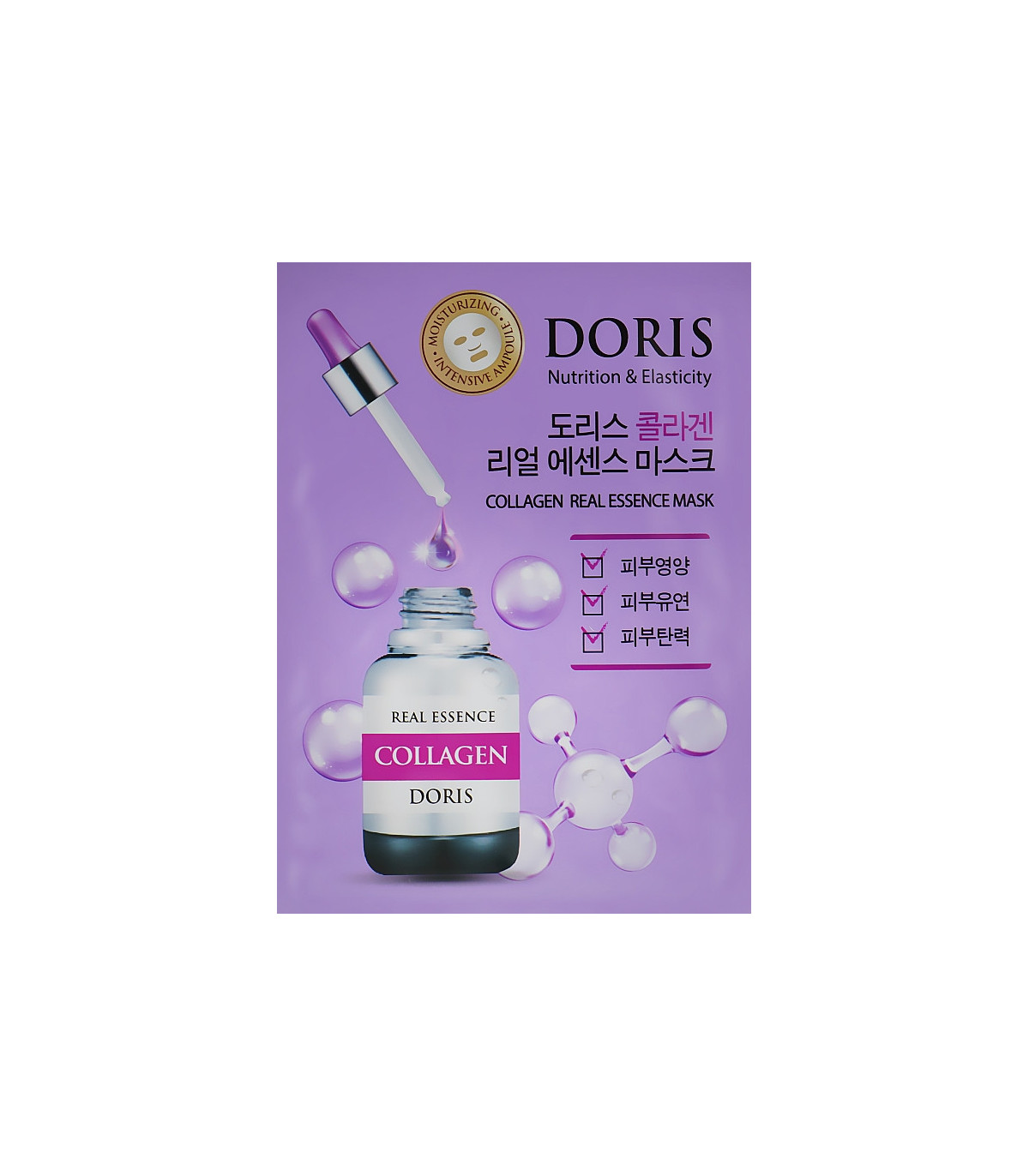 DORIS COLLAGEN REAL ESSENCE MASK es una mascarilla coreana intensiva de un solo uso impregnada con una fórmula enriquecida con colágeno, ácido hialurónico y extractos botánicos que aportan una hidratación profunda y mejoran visiblemente la elasticidad de la piel. Gracias a su contenido en colágeno hidrolizado y extracto de aloe vera, esta esencia concentrada ayuda a restaurar la firmeza cutánea y proporciona una sensación de frescura inmediata. Ideal para pieles deshidratadas, apagadas o con signos de envejecimiento, esta mascarilla coreana mejora el tono, suaviza la textura y deja el rostro revitalizado y luminoso desde la primera aplicación. Su diseño práctico en formato monodosis de 25 ml la convierte en una excelente opción para revitalizar la piel antes de un evento o como parte de un tratamiento semanal.