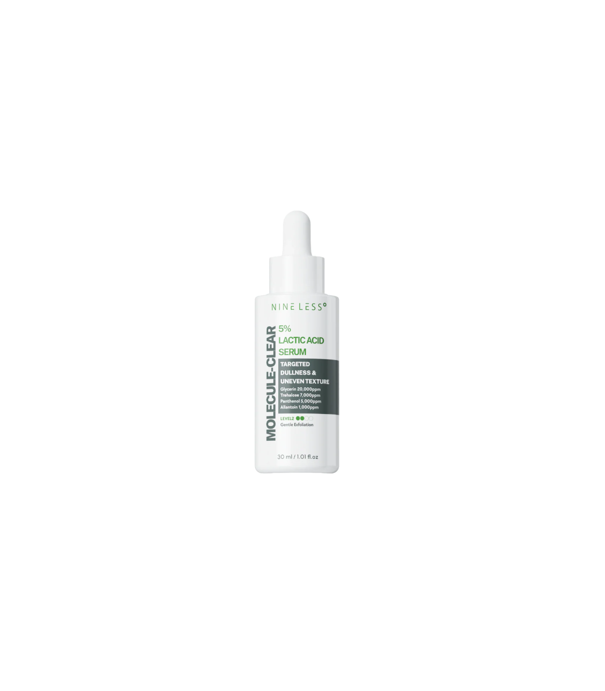 Nineless Molecule Clear Lactic Acid Serum es un sérum formulado para exfoliar delicadamente la piel y mejorar su apariencia general. Contiene ácido láctico, un alfa-hidroxiácido (AHA) que ayuda a eliminar las células muertas, suavizar la textura y promover un tono de piel más uniforme y luminoso.