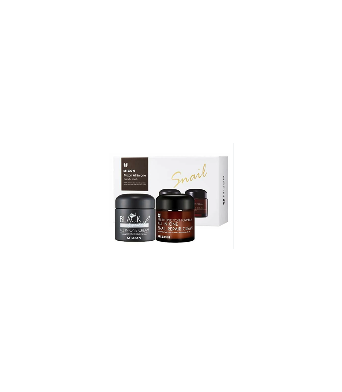 Contenido del set: Crema de caracol - Mizon All in One Snail Repair Cream, 75 ml + Crema de caracol negro - Mizon Black Snail All In One Cream, 75 ml.