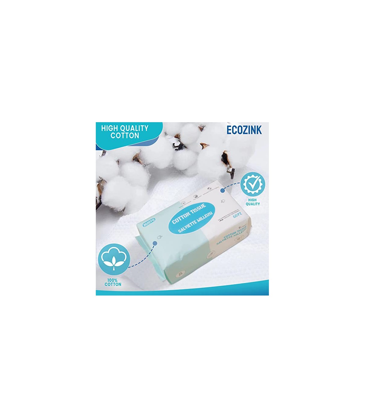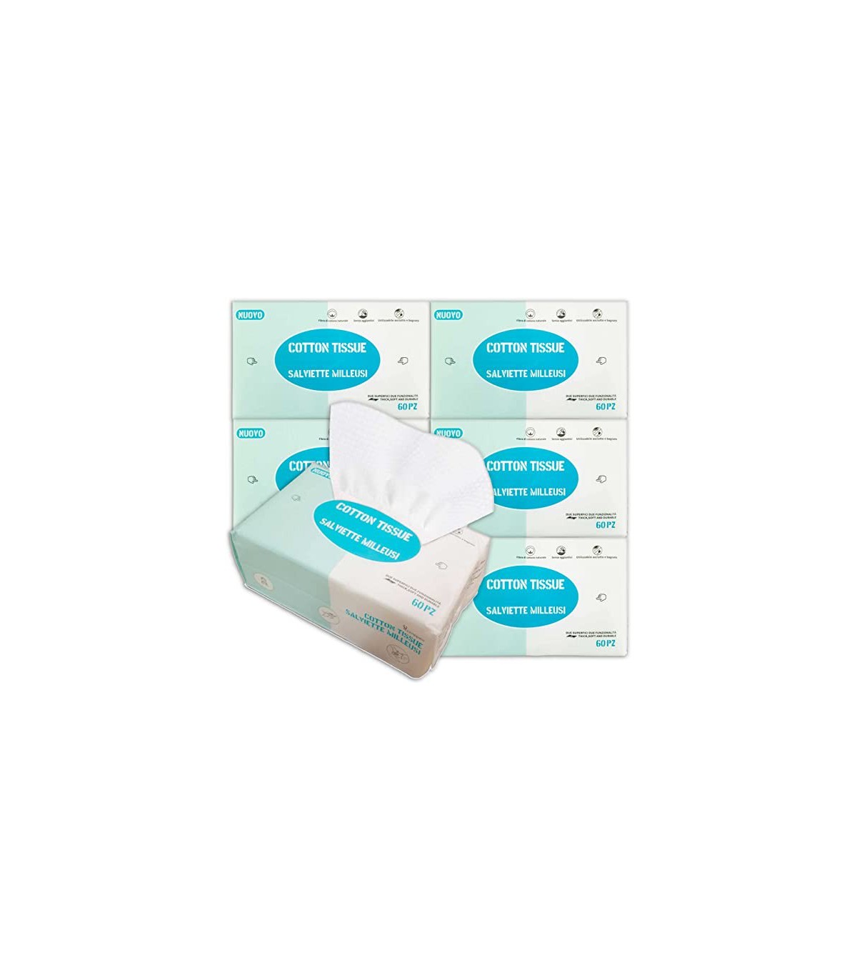 Cada paquete consta de 60 toallitas secas higiénicas desechables por paquete. Están hechos de algodón 100% natural, son suaves y resistentes a los desgarros. Es diferente al papel, pero puede actuar como un papel muy suave y esponjoso, pero con la virtud de que este tejido seco de algodón es duradero y reutilizable, por eso es ecoamigable.