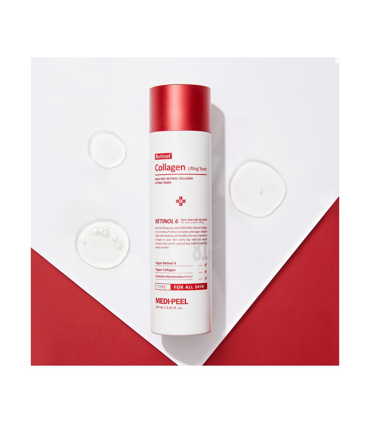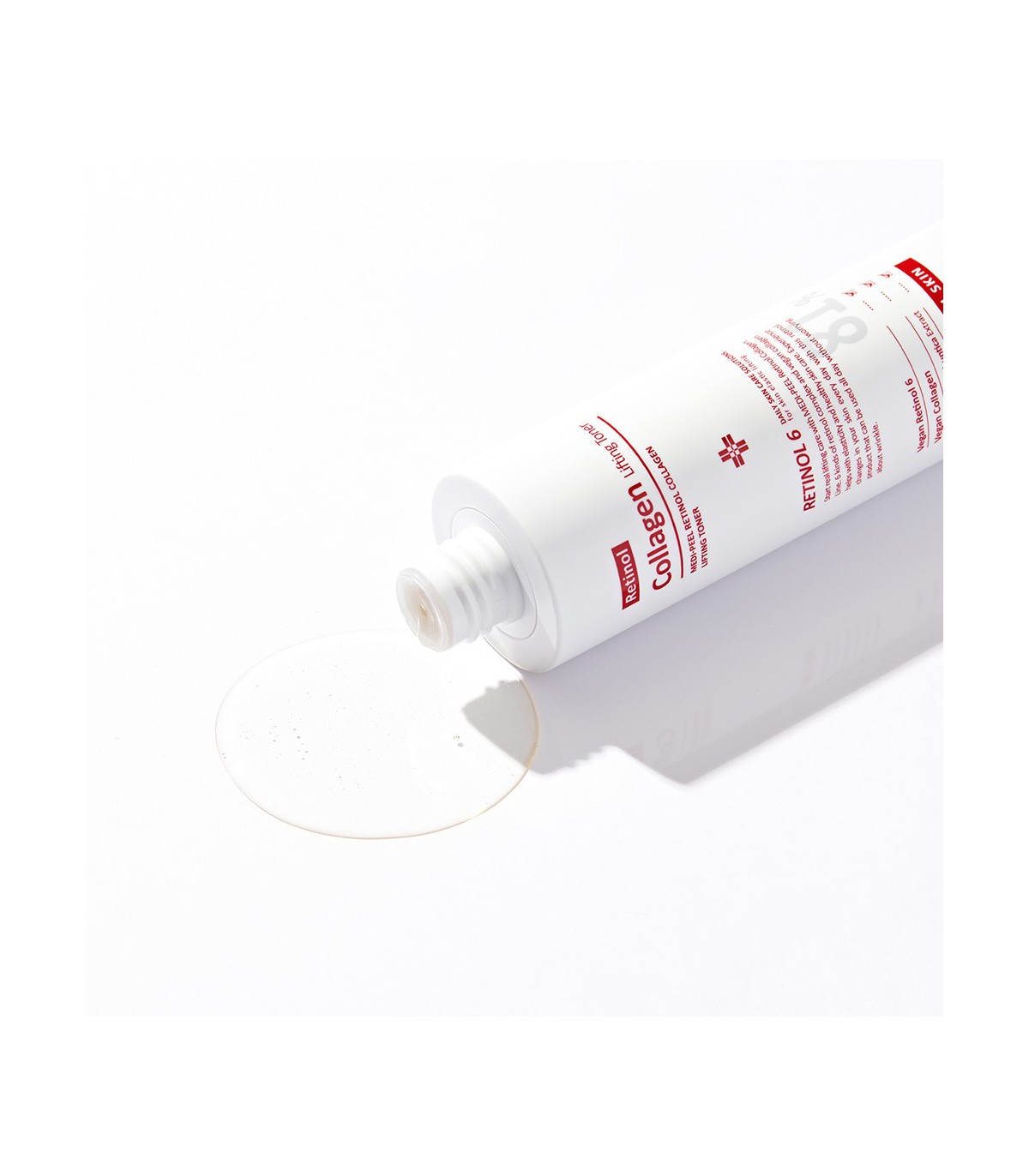 Un tónico esencia con efecto lifting que contiene 6 tipos de retinol y colágeno vegano para reducir las arrugas y tensar las líneas finas.